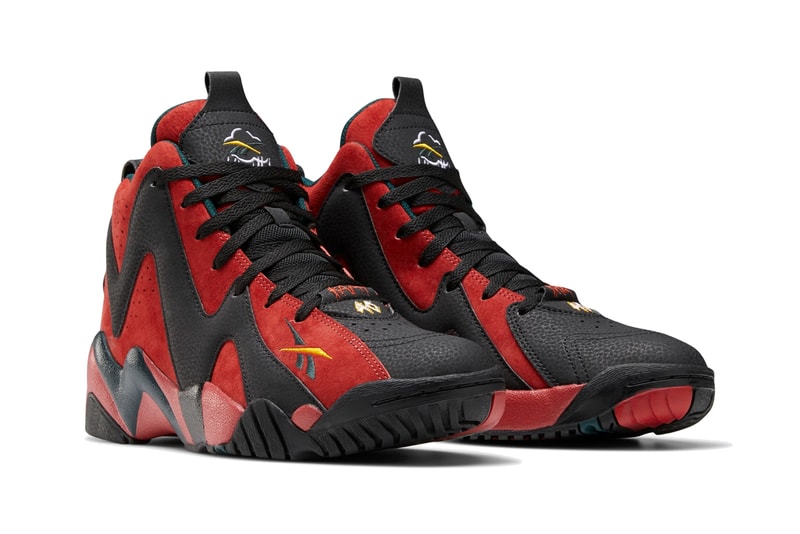 Uppers are constructed of rich red suede and supple black leather, the former of which appears on the base layer while the latter coats the signature zig-zagging overlays. Reebok Vector logos on the forefoot, heel, tongue and outsole alike take on a mixture of green and yellow, and the tongue also serves up a cloudy graphic for a nod to Kemp’s “Reign Man” moniker. The tubular bottom eyelet is split between “Kami” and “Kazi” on the right and left foot, and Kemp’s #40 is placed above each toebox. Special characters grace each heel tab and insole, with dark green collar detailing and two-tone red/black midsoles with DMX cushioning rounding off the look.