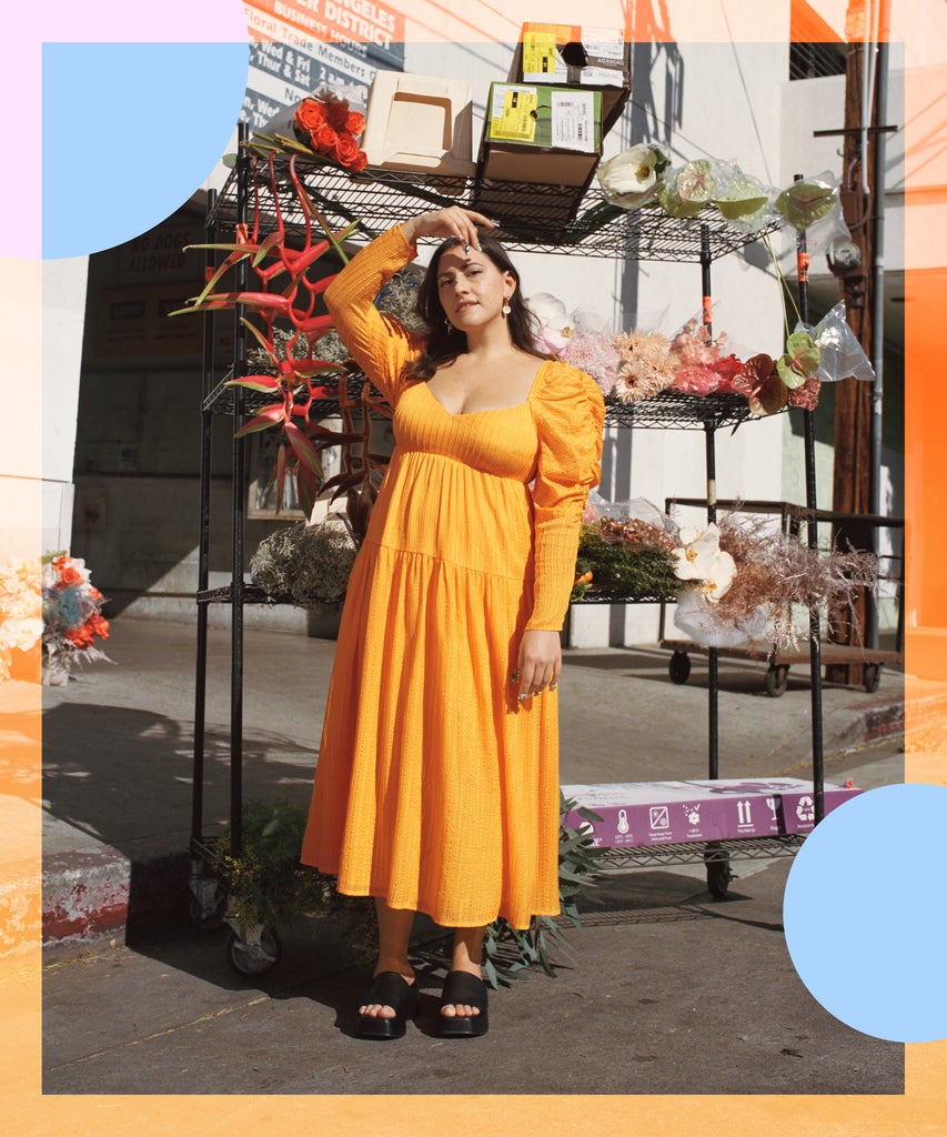 The capsule collection, designed with busy women in mind, features a silk halter midi dress in bright orange and a boxy padded shoulder wool blazer that pairs perfectly with a pair of pleated high waist wool shorts. But the standout look from the collab is the marigold-hued midi dress with ruched puff sleeves, a Pyo staple. Fittingly, L.A.-based floral designer Brittany Asch models the sunflower-bright look.