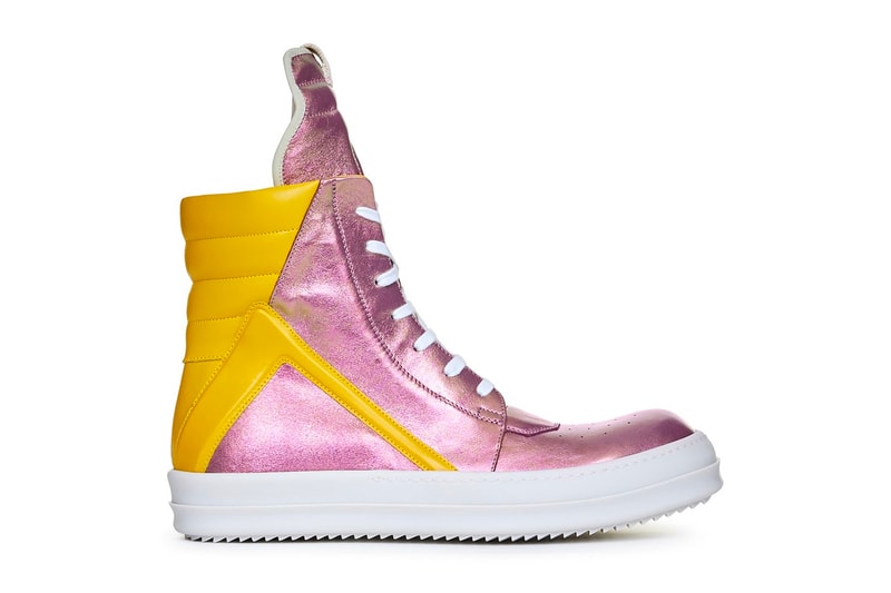 Replacing the black and white uppers are the colors yellow along with a reflective metallic pink color. Accenting the Geobasket is a metal zipper at the side, white laces, and a chunky white rubber outsole. Priced at $1,340 USD, the “TECUATL” Irise Geobasket can be found now over at Rick Owens.