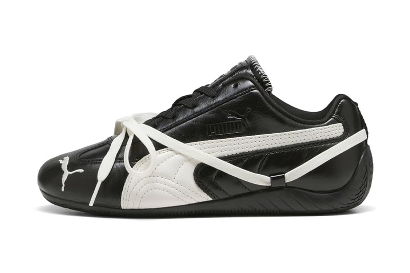 A standout piece, the Speedcat Ballet SD, arrives in a delicate off-white finish with soft laces that wrap gracefully around the ankle, evoking classic ballet slippers. A pink embroidered PUMA logo sits on the toe box, while a contrasting black elastic strap ensures a secure, slip-on fit. An all-black version offers a sleek, understated take — adding a stylistic edge to any outfit.