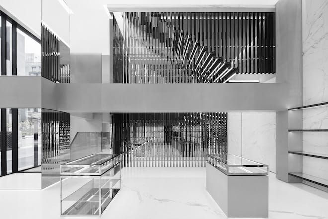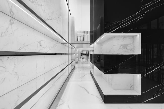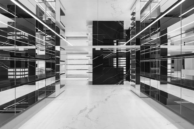 The two-level flagship store, situated along Seoul’s shopping district, is built with black-and-white marble walls and floors. Glossy and matte shelvings are also installed as well as suspended hanging rails. A selection of the brand’s Rive Droite pieces also decorated the space and overall, it is a reflection of the “minimalist and timeless sophistication of the Art Deco style.”