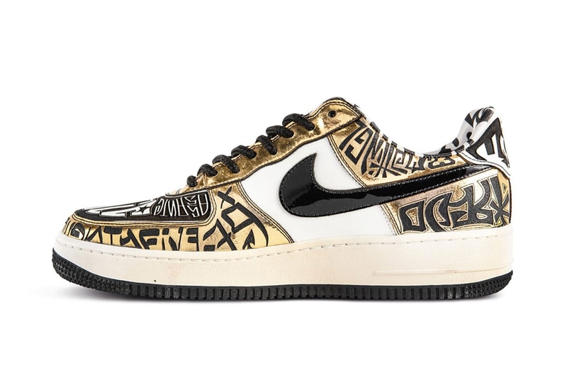 The Premium Georges “Entourage” sneakers are dressed in white with light blue tumbled leather overlays and gloss leather Swooshes on the laterals. The heels feature “LA” and “Queens Boulevard” text in reference to the character’s Los Angeles roots and Vincent Chase’s performance in the fictional film “Queens Boulevard.” Designed by Bruce Kilgore, the Gold Fukijama Air Force 1 is found in white with gold overlays and features mismatched black and white toe boxes. Unique graffiti-style text is laser-etched throughout the uppers extending to the inner lining, and UNDEFEATED and Entourage logos run across the tongue tabs with additional motifs found on the heel tabs.