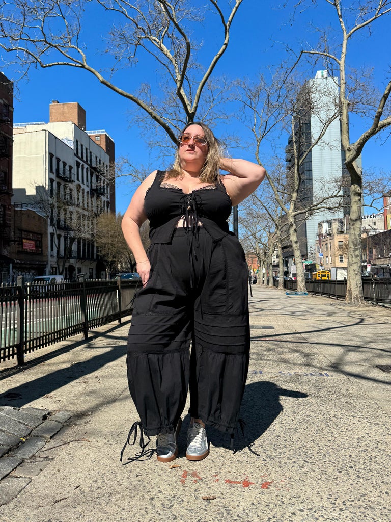 By Day 3, my desert festival fashion guidelines were solidified: breathable materials, bottoms you can comfortably sit in, darker colors or prints, and comfortable sneakers. This new set from size-inclusive NYC designer Tamara Malas ticks a lot of boxes on my checklist: The unlined cotton is lightweight and breathable, the adjustable tie bottom detail of the bloomer-inspired pants keeps them from touching the ground, and the black colorway is good for the inevitable sitting on the ground (the brand also carries the style in cream). The tie front top is also a great option to add a sheer layer underneath or include a pop of color with a fun bra. (I went with a sheer lace trim number from full-bust favorite Elomi, which complemented the looped lace trim on the top.) I usually size down in Tamara Malas, as many of its pieces run large, but I decided not to in this cotton set, and it was the right decision. I’m generally a size 18/20, and the top and pants fit perfectly in an 18/20, so I’d say this set is true to size. Paired with these cushioned silver Puma sneakers, this is a simple yet cool look that can stand up to a full day in the desert.