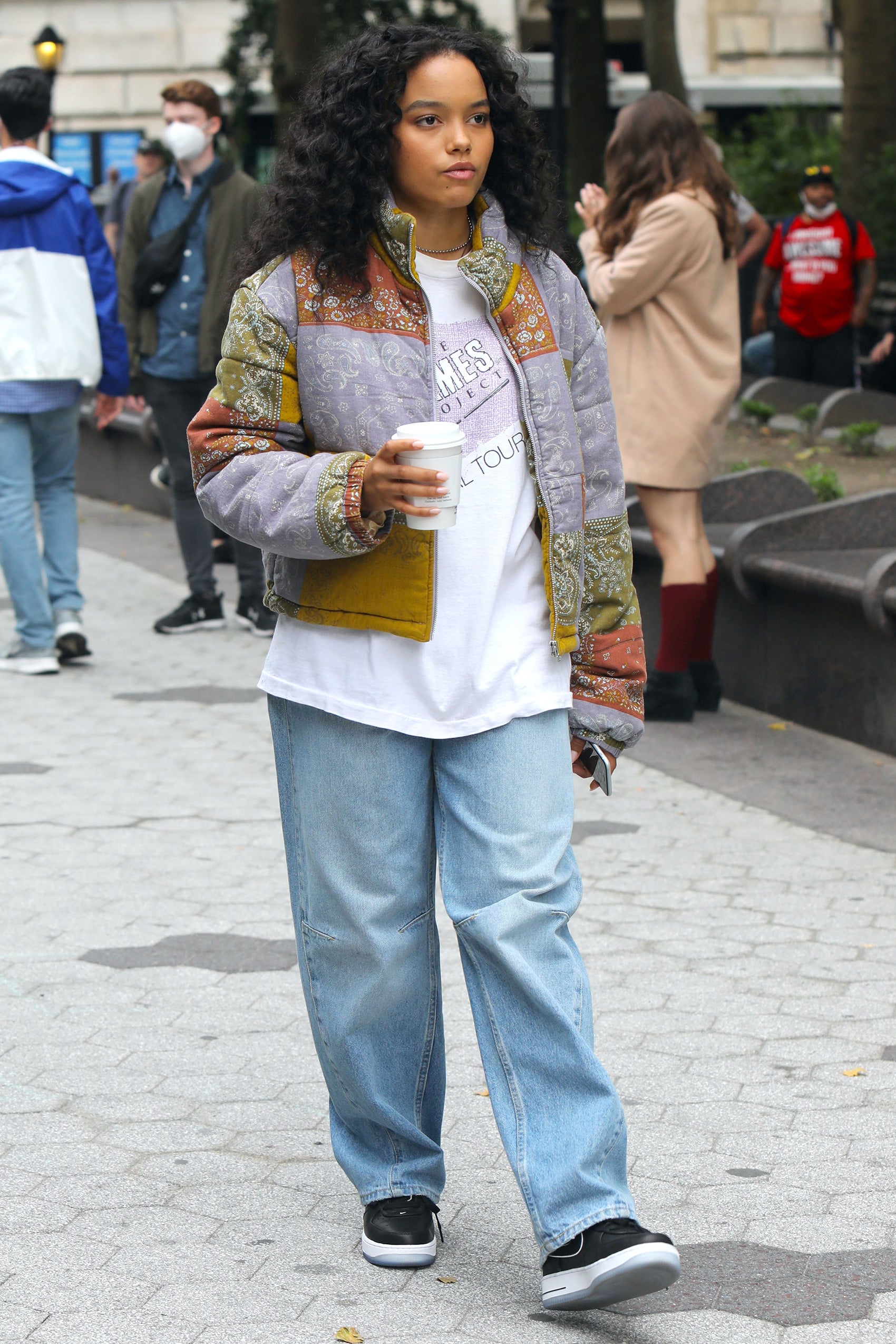Whitney Peak wearing an Alex Mill cardigan, Dr. Martens boots, and a Melanin Apparel tote bag. Photo: Jose Perez/Bauer-Griffin/GC Images.