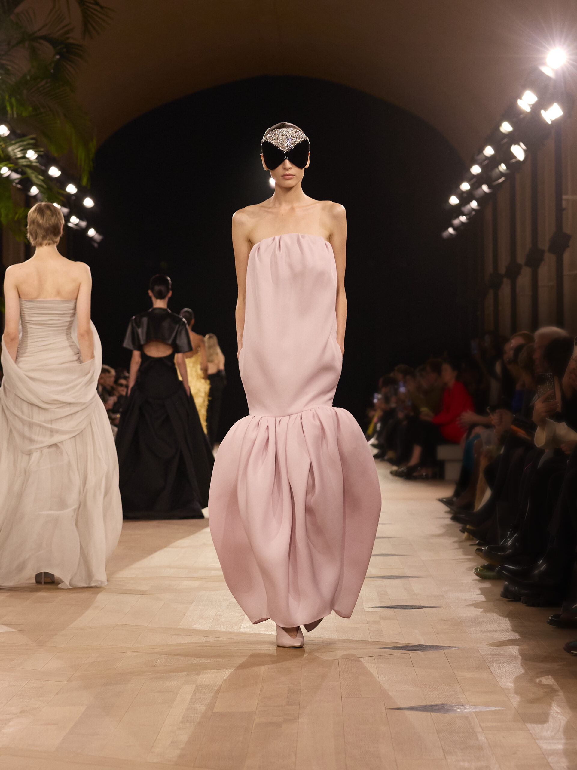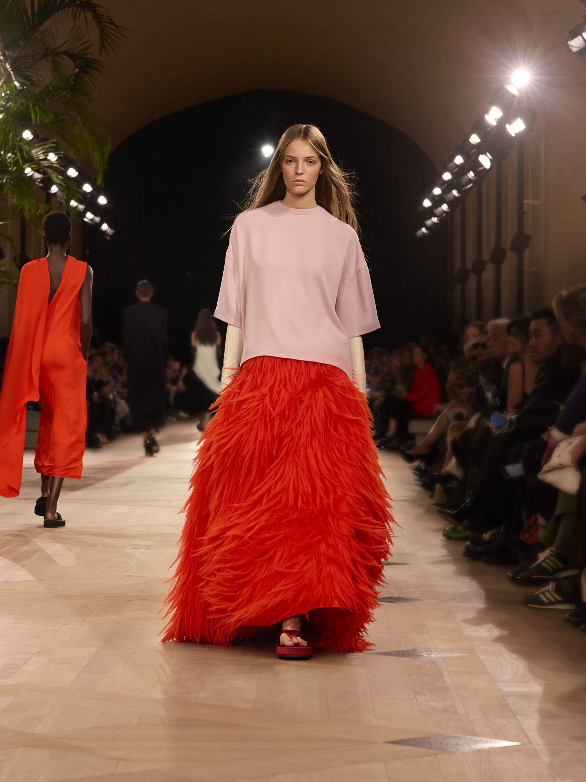 At Balenciaga, Pierpaolo Piccioli’s debut Summer 2026 collection exemplified this approach of recalibration. Rather than homage, Piccioli reframed Cristóbal Balenciaga’s legacy for today, integrating humanity at the center of creation and exploring the relationship between body and fabric as a dynamic, architectural exchange. The introduction of Balenciaga’s neo gazar fabric — a double-face weave combining gauze and organza — allowed for sculptural silhouettes with exceptional amplitude, combining structure with fluidity. Knits translated archival fabrics into new materialities, while self-fabric embroideries of flowers and feathers became architectural statements rather than decorative touches. The runway was a dialogue between past and future, preserving the house’s identity while redefining its vocabulary for the modern wardrobe. Within the show space, a resurrected Parisian salon scented with Getaria — the Balenciaga fragrance named after Cristóbal’s birthplace — completed the immersive, multi-sensory experience.