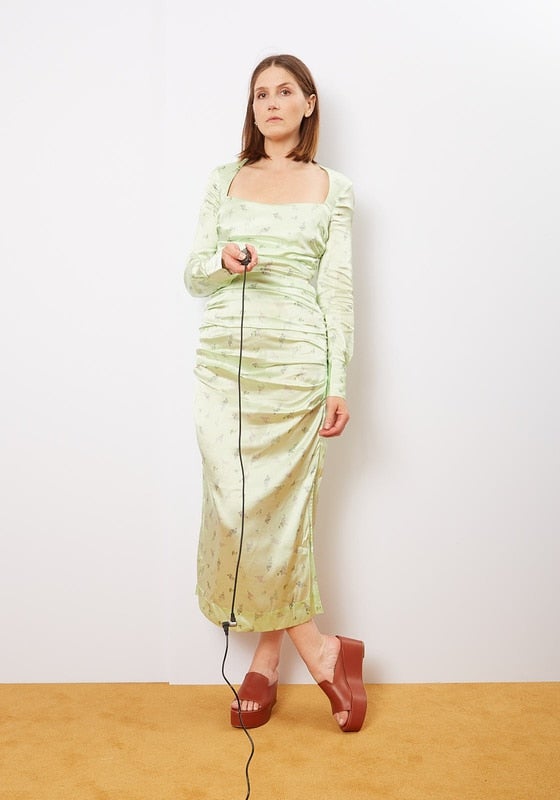 Ganni Patina Green Long Sleeve Silk Stretch Satin Dress, $, available at
