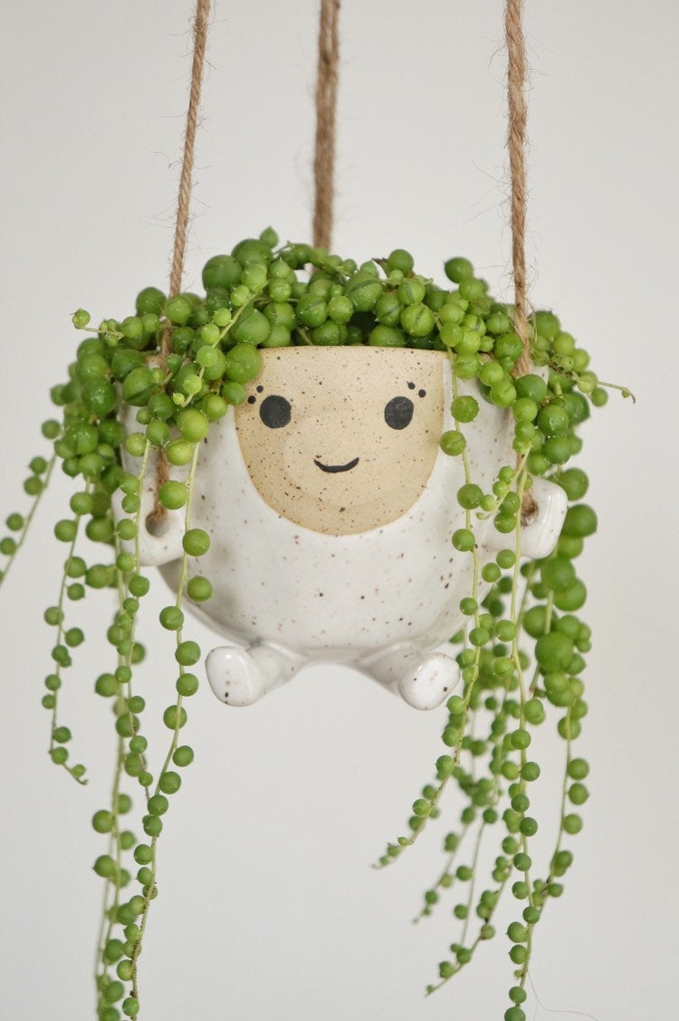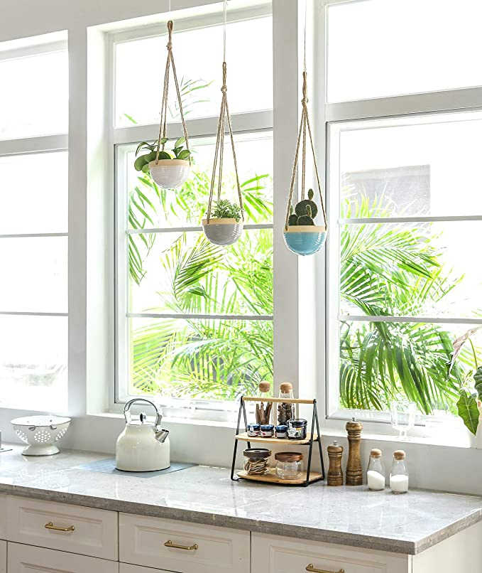 This sweet trio of ceramic planters hanging from simple jute ropes is ready to brighten up a kitchen to living room or bedside corner.
