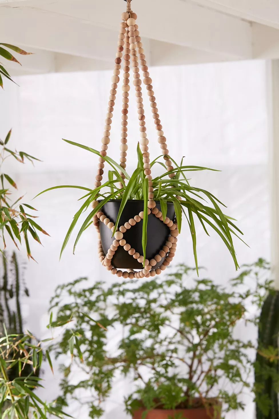 Upgrade your living space with a sweet hanging pot crafted from wooden beads that will easily complement a variety of interiors.
