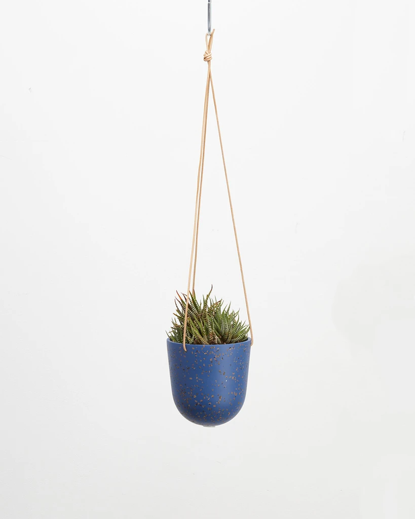 This pretty planter is artfully crafted from a rich blue, terrazzo-speckled resin that’s suspended by a tan-leather strap.