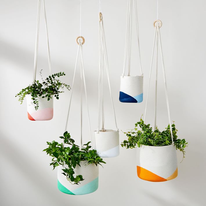 Crafted from cotton rope and accented with handpainted design, these coiled hanging planters will add a vibrant elevated statement inside any space.