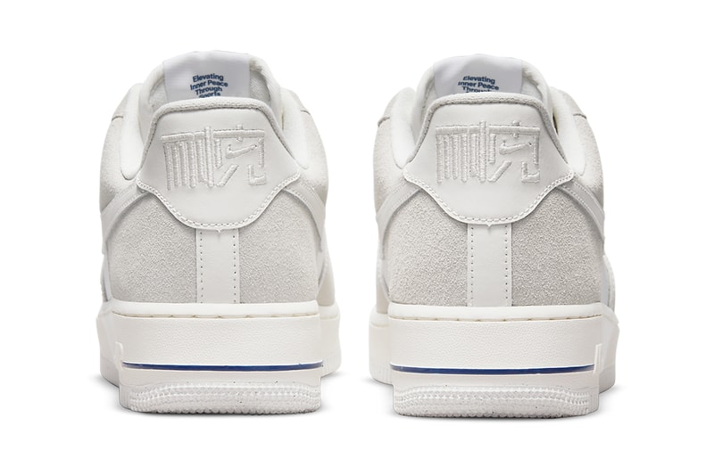 Designed with somewhat of a prototype-inspired vibe, the uppers of these kicks are fashioned with lighter gray suede panels along the forefoot, toe boxes and heels, while white accents are positioned on the quarters, heel overlays and interior lining. Instead of the customary “Nike Air” notation that is parked on the rear, the embroidery here states “NAI-KE” and the inside areas of the tongues spell out “Elevating Inner Peace Through Sports.” Moreover, tiny splashes of a deeper shade of blue appear around the first set of lace loops as well as the stripe that sits on the lower portion of the midsole towards the back.
