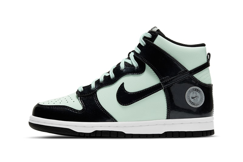 Visually, this high-cut variation effectively merges together tones both neutral and pastel. The former is marked by the overlays and Swooshes which are submerged with glossy black patent leather, while the latter makes appearances through the minty green skins that color-block atop the tumbled leather paneling across the upper and the shoe laces. Located on the lateral heels, a translucent, circular badge is ornamented with Nike and NBA logos stacked on top of each other, and arrive neighbored by the words “All-Star Indiana Indianapolis” which points to the destination in which the 2021 star-studded hoops teams will battle it out on the court next year.