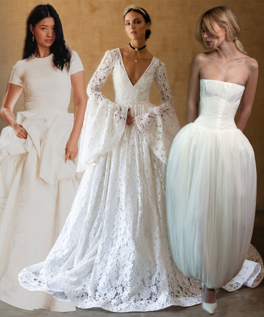 Voluminous skirting leans heavily into bodice-ripping period piece epics — but with contemporary takes. Andrew Kwon, Ines di Santo, and Markarian bring the 18th-century pannier (extreme side-hoop skirts) into TikTok times, while Sarah Seven, Lihi Hod, and Yellow by Sahar’s styles boast tubular frills. In terms of embellishments, Viktor & Rolf Mariage adds “sculptural puffs” to a gleaming ball gown and a jacquard Tudors-meets-Pretty in Pink mini dress. Meanwhile, Marchesa Couture, now exclusively shoppable online at David’s Bridal, accentuates the voluminous skirt with an oversized rosette.