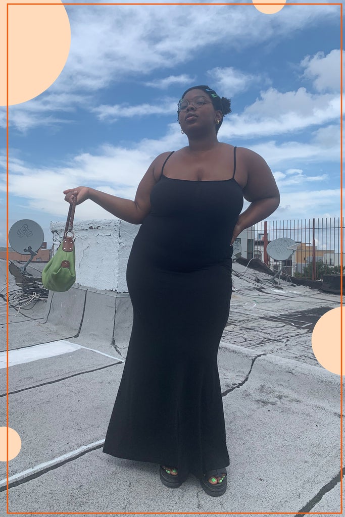 “Upon first opening up the package and pulling the dress out, it seemed so slim, so I was worried it’d hug my body in a way that made me feel uncomfortable and restricted,” Chichi Offor, Associate Affiliate Writer, says. She tried the black version of the dress in the brand’s largest size offering, a 3X. “It’s very common for some brands to carry clothing in what seems like extended sizing that doesn’t actually fit plus-size bodies, so I was worried that would be the case with SKIMS,” she explains. But, just as those on TikTok predicted, her worries were qualmed when she slipped the ribbed bodycon over her head.