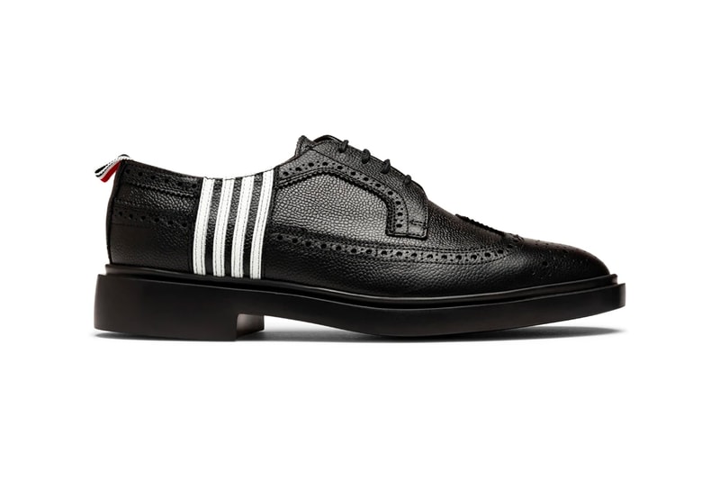 The shoes also feature a more contemporary hard-rubber outsole, and are finished with Thom Browne branding on the insole and the signature red, white and blue grosgrain ribbon heel pull tab. Priced at $950 USD, these can be found now over at Feature.