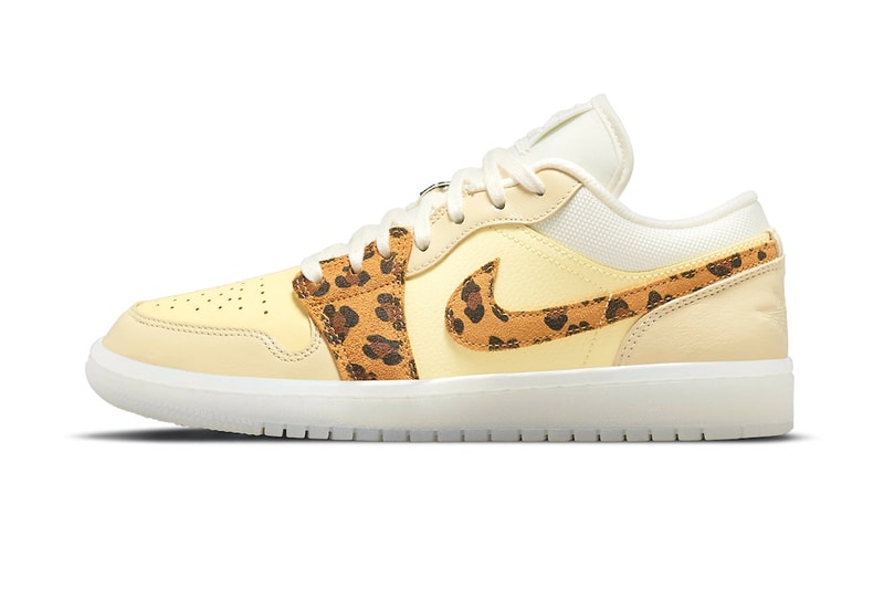 This Air Jordan 1 Low sees yellowish leather on the uppers with tan overlays hitting the mudguard, the eyestay and the heel. White mesh detailing arrives at the collar, while bold leopard prints are applied to the Swooshes and forefoot. Motifs of the celebration can be seen in the form of embossed “8.8.21” tongue tags, special SNKRS Day insoles that spelled “SNKRS got ’em.” Subtle animal prints beneath the translucent outsoles complete the look.