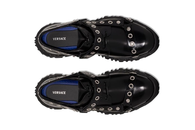 The derbys’ outer and lining composition are both crafted in 100% leather, staying true to its shoe category with a typical rounded toe and open lace-up front, the latter a result of its shoelace outlets placed atop its vamp. Dominated by BDSM inspiration, the Italian fashion house adds harness-looking straps over the derbys’ lateral side and across its front, with silver-tone hardware that is reminiscent of the punk rock-popularized double grommet leather belt. Finally everything is placed atop an elevated 100% rubber sole with blue-lined insole and a red Versace Medusa’s head facing its outer base.