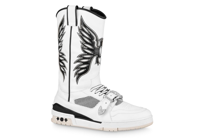 Coming in “Black/White,” the unique footwear designed by Virgil Abloh places LV 408 Trainer tooling under a phoenix marked cowboy boot upper accented by a vamp strap. The hi-top version of the luxury fashion house’s current flagship sneaker is crafted from extremely supple calf leather and embroidered with a distinctive motif on the sides. According to LV, each pair is made in Italy and requires seven hours of stitching to complete. Aside from the Louis Vuitton script signature at the rear, Monogram Flowers mark the gel-injected sole unit.