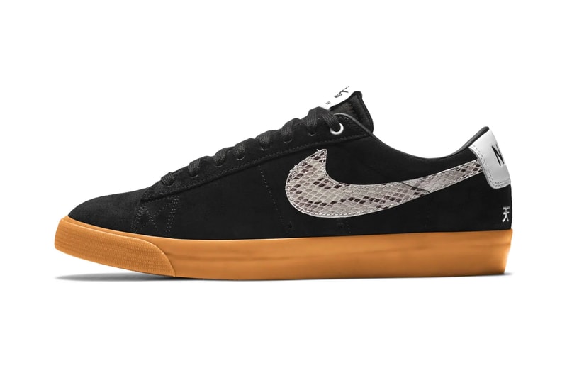 Utilizing a clean black suede base, the low-top iteration is accented by snakeskin print Swooshes and contrasting embroidery at the rear that expresses Heaven/Tokyo (天国/東京) in Japanese Kanji. Additional branding comes in the form of “NIKE” heel tabs and the usual model marking tongue tags. Rounding up the design of the shoe are Zoom Air-assisted co-branded insoles and bold gum rubber sole units.