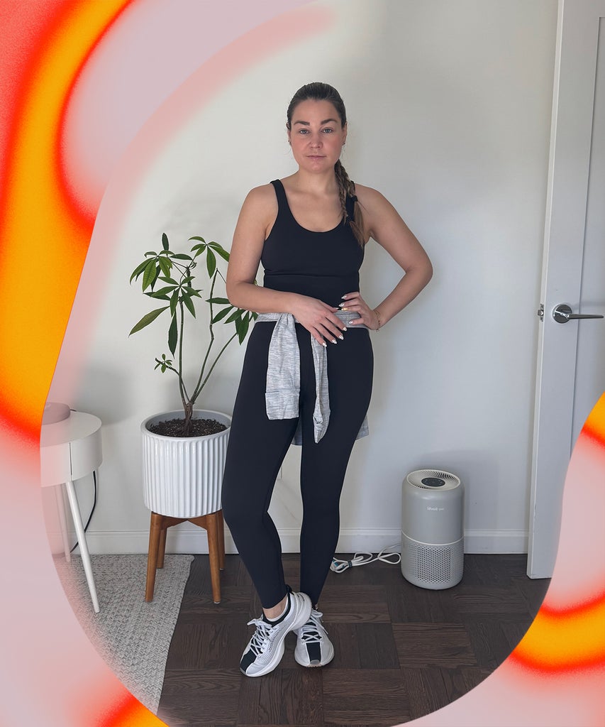 “I also enjoyed the tank top. I ordered it in a size 10 (my true size), which felt a bit roomy. I think, had I gone down one size, it wouldn’t look as baggy, and I’d feel more secure. Still, I really appreciated the medium-support bra cups, which allowed me to go sports bra-free and not feel insecure about it. The length was also great because, although it’s cropped, it lands below my belly button, which kept my stomach fully covered during every stretch and movement (a rarity!).” — Victoria Montalti, Associate Fashion Writer