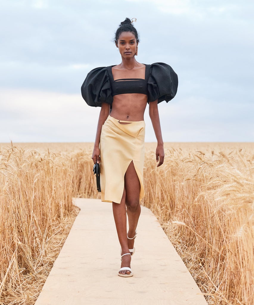 In July, Jacquemus’ spring ‘21 collection included countless belly-baring silhouettes, in the form of crop tops and unbuttoned high-rise skirts. Later that season, midriffs were on display during Paris Fashion Week: At Christopher Esber, crisscrossing, floss-like strings adorned the waists of models; at Chanel, bra tops were paired with low-rise, drawstring pants that provided minimal coverage; and at Miu Miu, the Sporty-meets-Baby-Spice collection featured tank tops that showcased the belly button area. Even Hermes unexpectedly made a case for wearing a leather bralette.